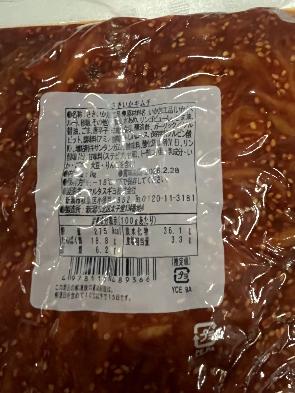 産地は加工地です さきいかキムチ1k袋 2×6 賞味、解凍後D+14 規格変更に伴い在庫処分 通常単価よりk1000くらい安いです!
