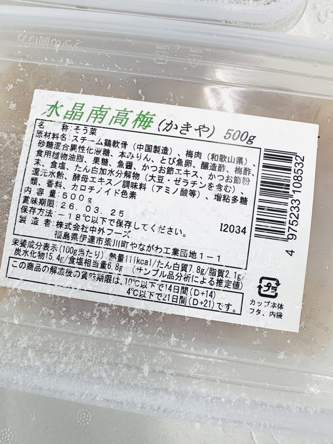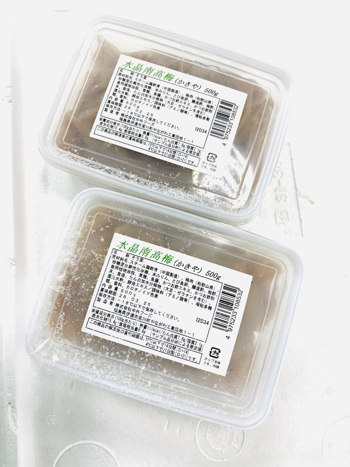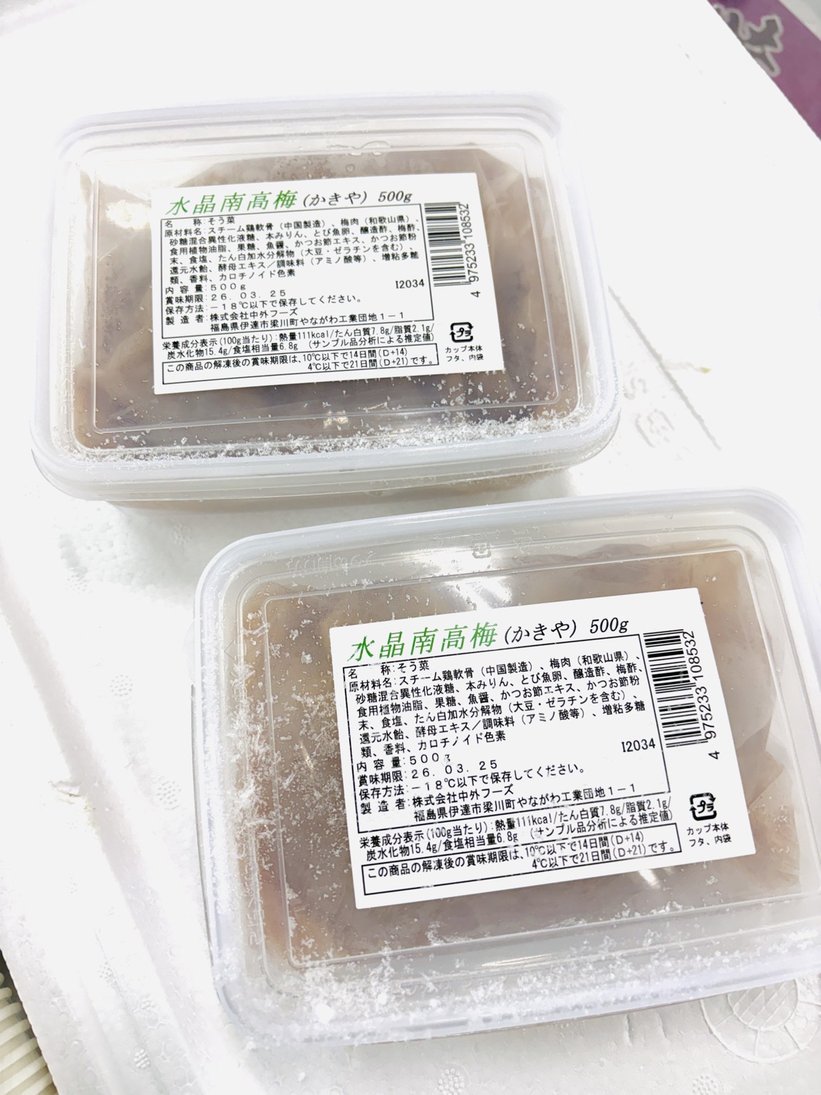 今品薄になっている梅水晶(水晶南高梅)です。 サメ軟骨の入荷がないので、鶏ヤゲン軟骨100%で仕上げています。鶏軟骨というとゴリゴリしたイメージですが、丁寧に細切りにしてあるので食感は良いと思います。 味は人気の出汁が効いたタイプの梅水晶(水晶南高梅)です。紀州南高梅を使用しているので、梅の味わいは美味です。水晶南高梅をお使い頂いてる方でしたら、同じ味ですので馴染みやすいと思います。 冷凍品で在庫もありますので、定番メニューでもお使い頂けます! ※鶏軟骨を正肉と分ける工程を中国の工場で行っているので(中国製造の表記)ですが、加工は福島県になります。