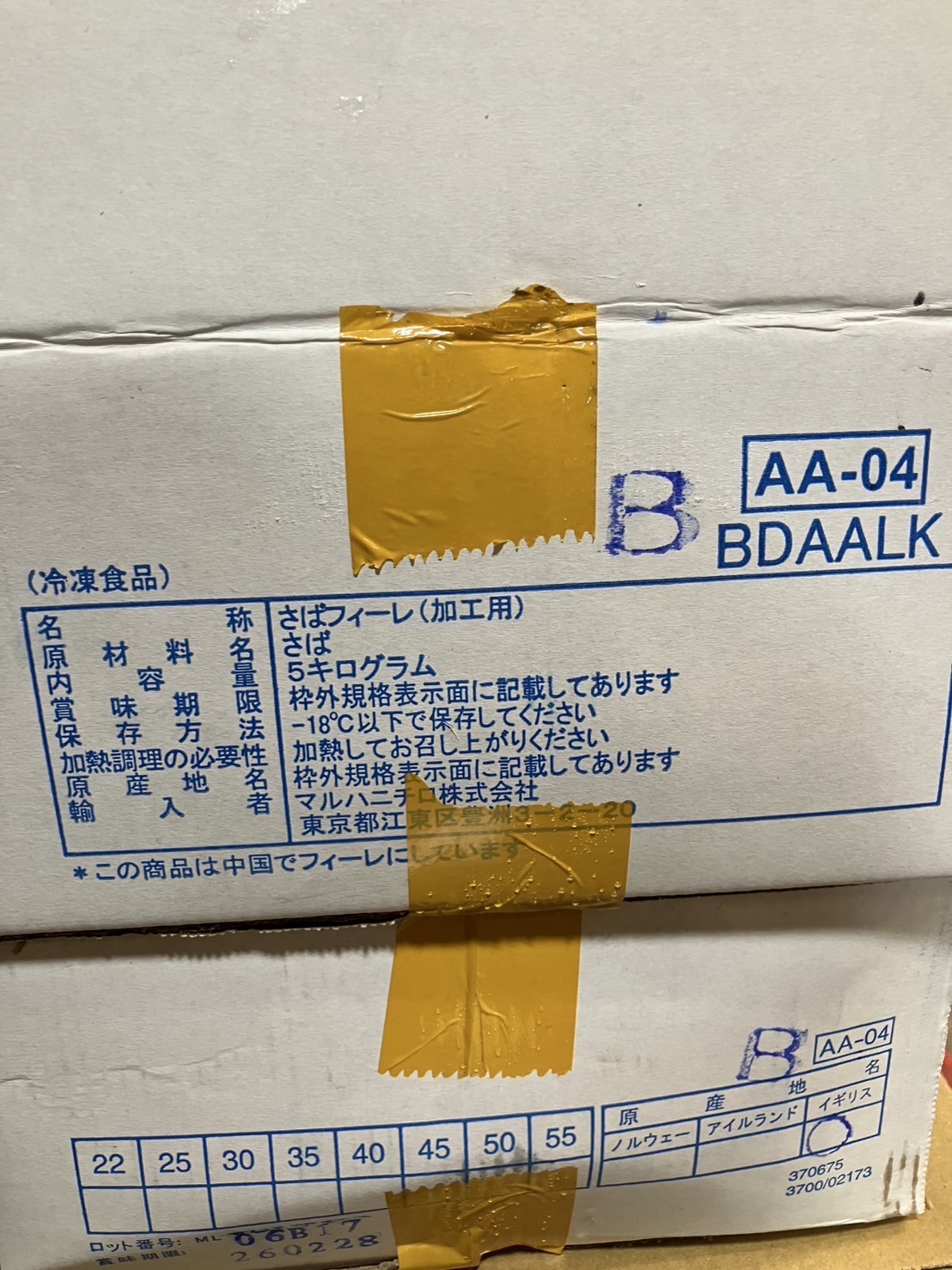 イギリス産/中国加工 無塩さばフィレ(B) 5k×2 サイズミックス おおよそ1枚140/190g