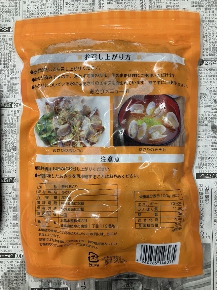 中国産 冷凍 から付きあさり 320g 12×3 賞味7/15