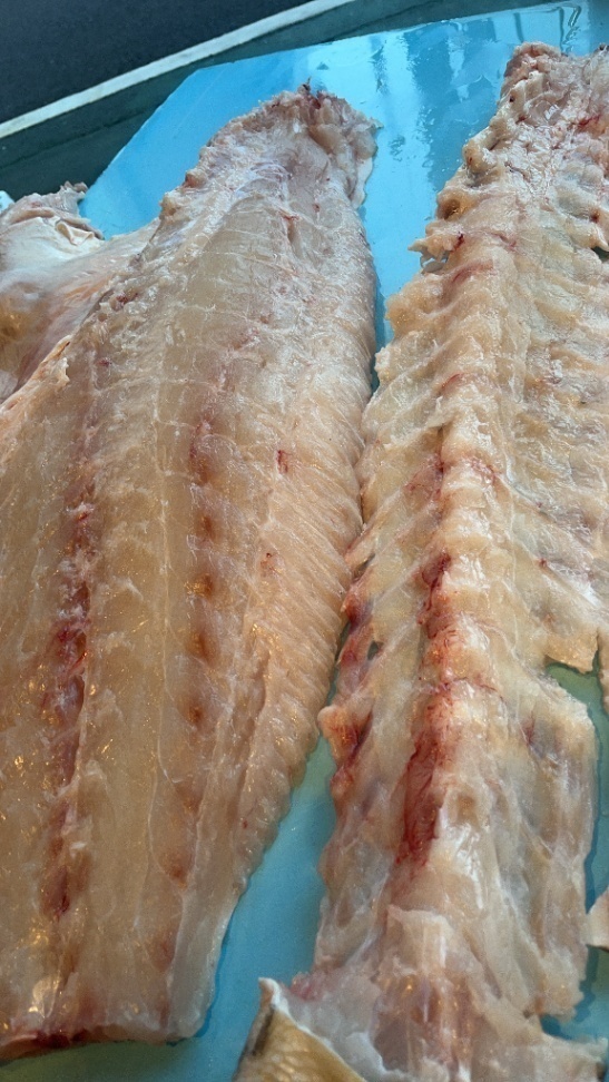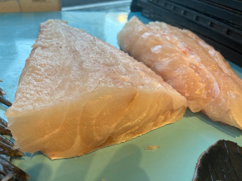 相模湾産 天然活〆クエ【九絵】(大型6~30㎏サイズ)分解後の腹側骨付き身(皮付き骨付きの身小分けブロック〔ウロコすき引き済〕 200~500g真空パック1段約2kg