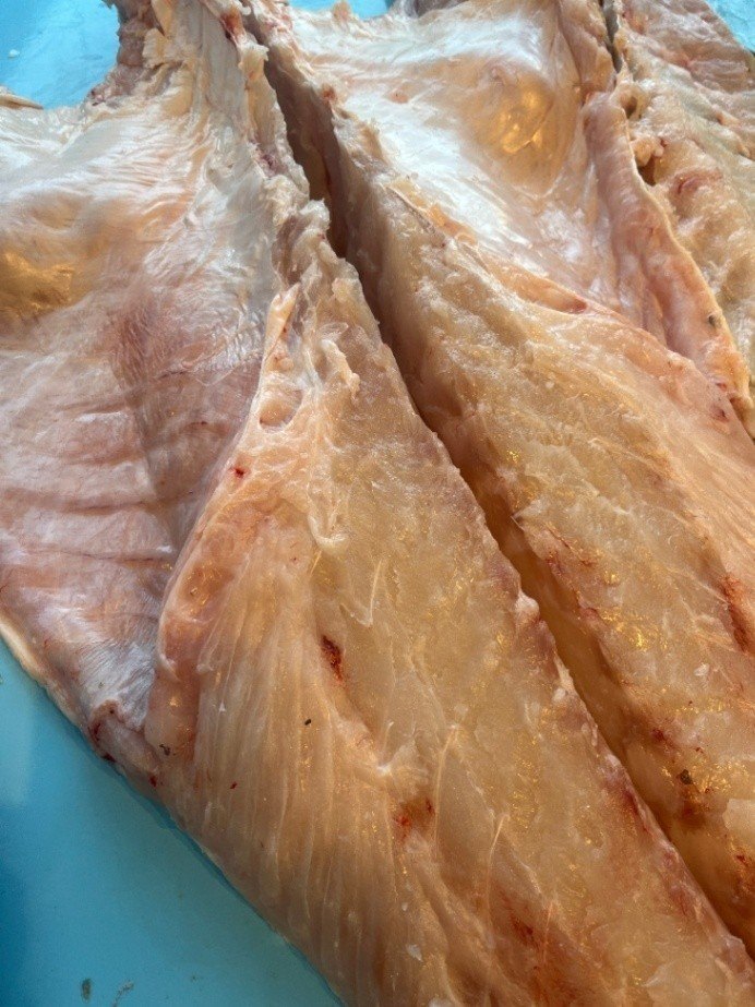 相模湾産 天然活〆クエ【九絵】(大型6~30㎏サイズ)分解後の腹側骨付き身(生食可能鮮度 皮付き骨付きの身小分けブロック〔ウロコすき引き済〕 200~500g真空パック1段約1kg