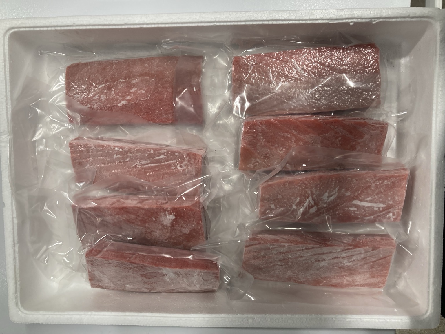 宮城県産天然本鮪✨ 脂有り鮮度の良い鮪の一部を、可食部100%の柵(不定貫)に切り分け急速凍結したあと真空包装しました。 冷凍品ではありますが、-60度で保管し品質を保っています。 お盆期間中に使い勝手の良い商材です。