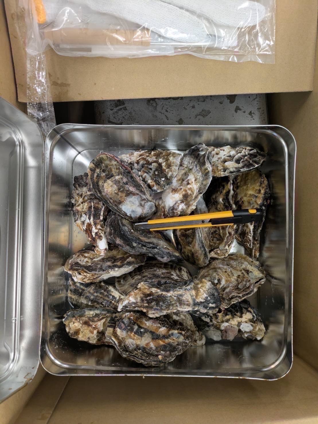 広島県産 加熱用 ガンガン焼き 殻付かき1.5k缶 約80〜100gくらいのが20粒ぐらい入ってます。 貝剥き、軍手入り 1.5k缶×5入