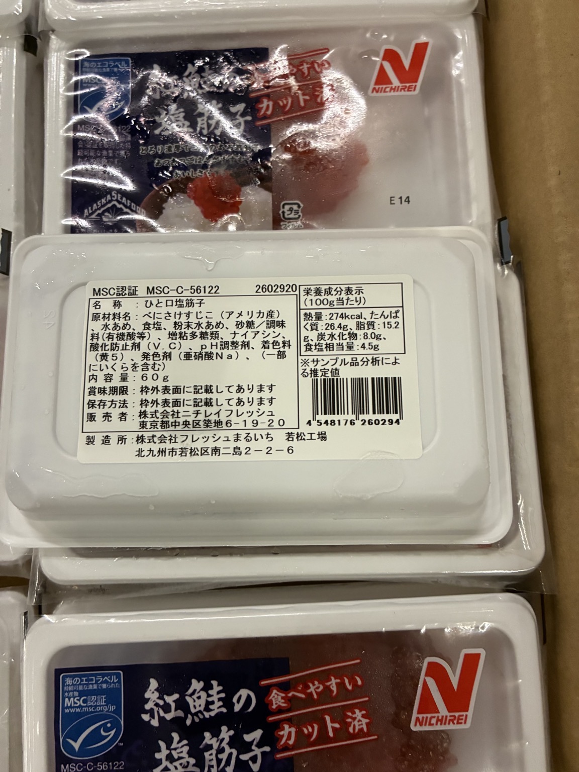 アメリカ産 ひと口 紅鮭の塩筋子 60g 20p入 今のロット無くなり次第大幅値上げ 筋子、イクラ関係、相場まだまだ強めです。 年末分の手配などはお早めに! このアイテム以外にも探し物あれば問い合わせお願い致します。