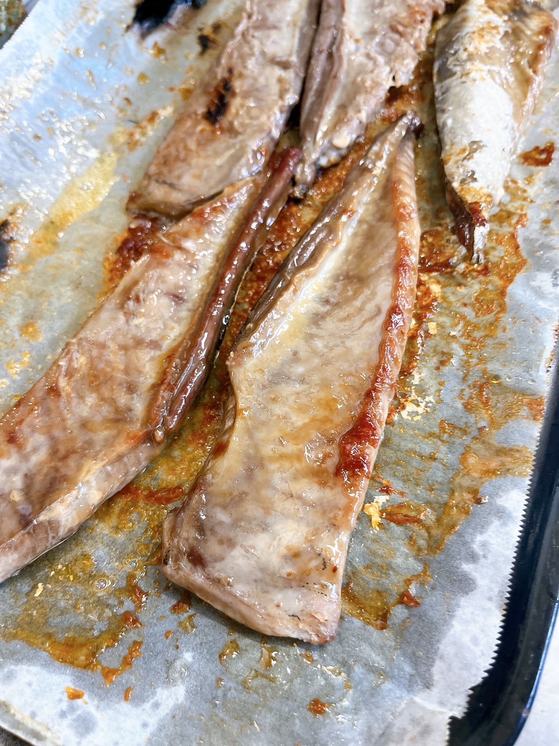 腹皮 無塩 鹿児島県産 かつお節を作るときに出る脂の乗った大トロの部位なので、地元では昔から人気です。 1尾から1枚しか出ないので希少価値があり、たくさんでるのはかつお節の産地のみです 一夜干しなど干物にすることも多く、スーパーでは干物の腹皮も多く見かけます。 一昔前は鮮度が悪く県外者からは臭いイメージがありますが、いまは温度管理がしっかりしているため臭みはそれほど無いようです。