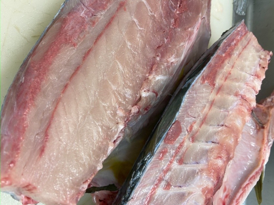 小さな汐子サイズから、大型のカンパチまでいろいろなサイズが水揚げされる相模湾の天然カンパチですが、中型サイズ(2㎏~3㎏サイズ)のものを活〆脱血神経抜きし、オゾン水で水洗いを済まし、身下ろしして皮むきスキン(5枚おろし節取り皮むき済み)の状態で真空パック、ー80℃で瞬間凍結にまで処理してありますのでパックのまま流水で解凍後、直ぐお刺身で提供できます。お刺身材料の予備としても重宝しご利用可能です。