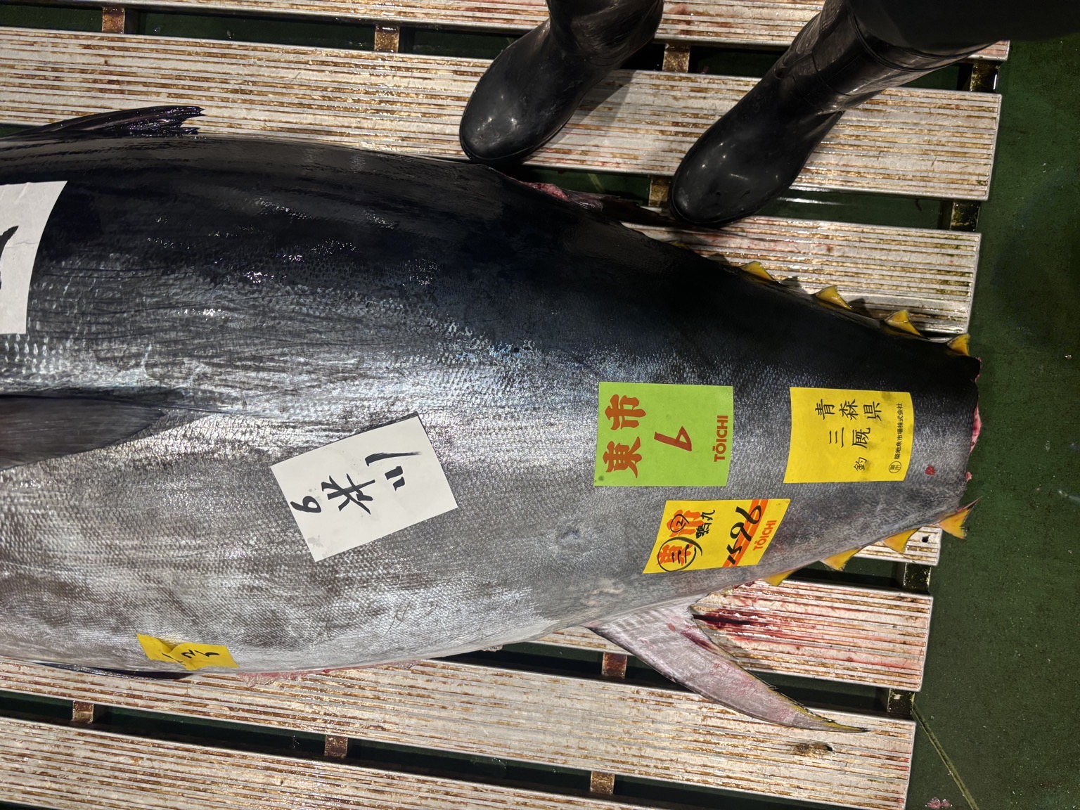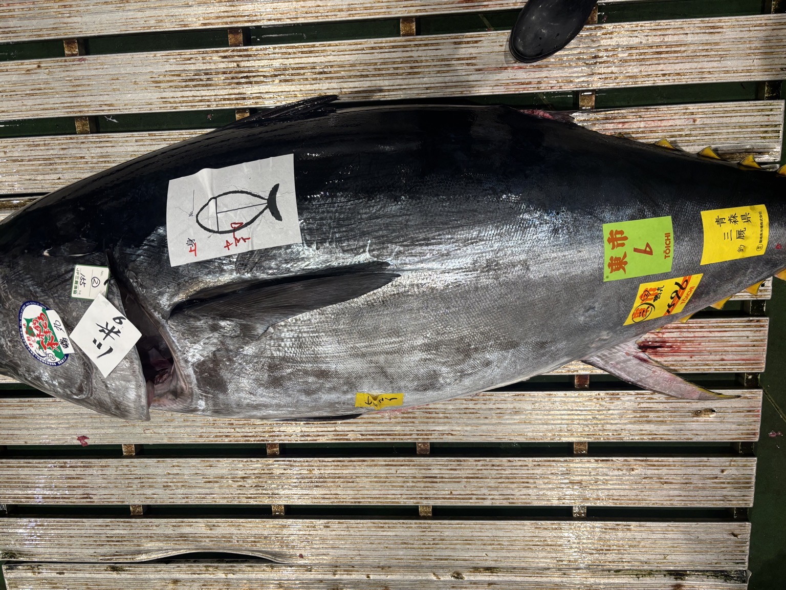 青森三厩産 釣り、脂あります。赤身もしっかりした魚です。おすすめです。 天然生本マグロ出品致します。 魚体159.6kg 是非お願い致します。