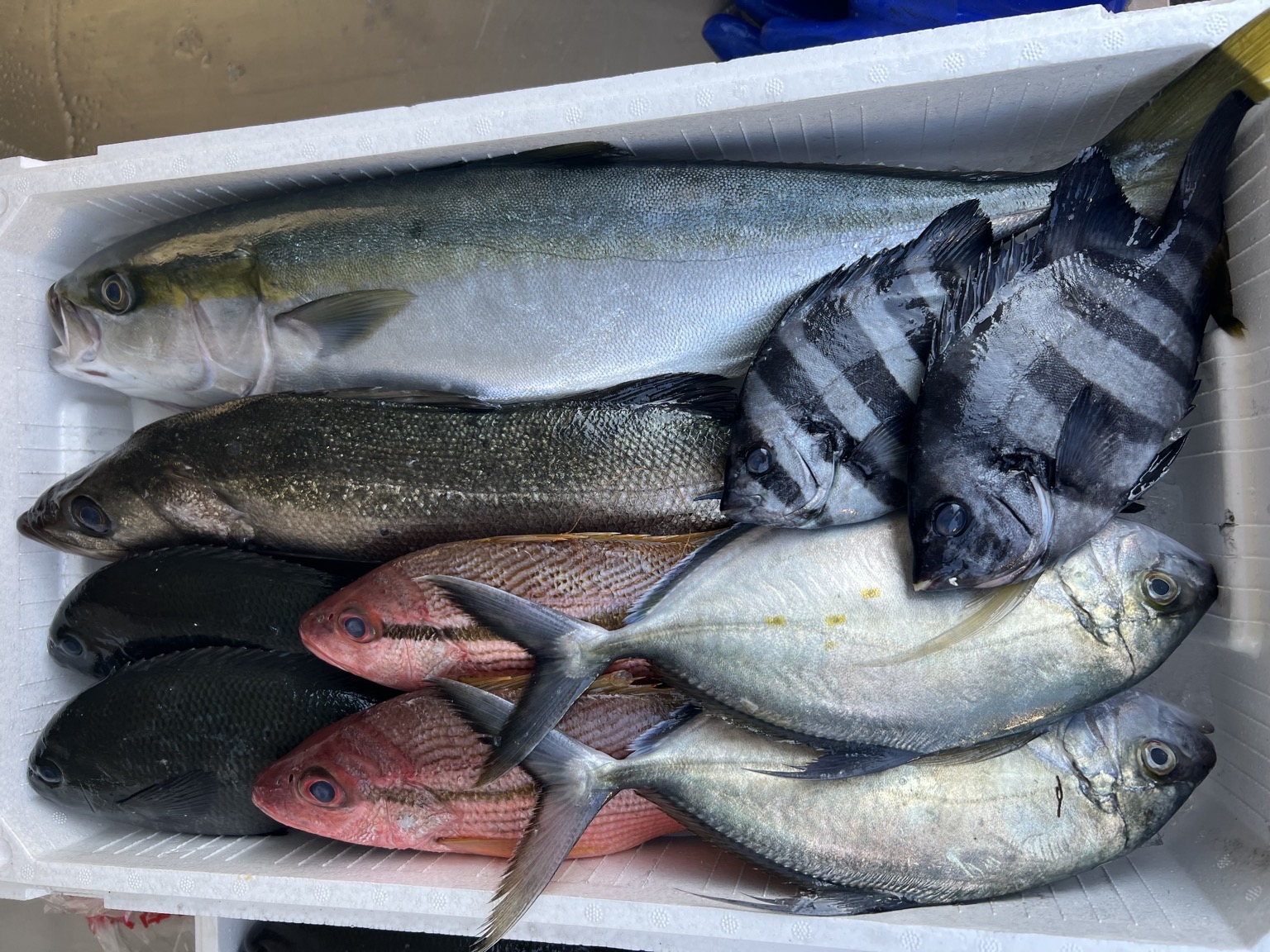 イシダイ、スズキ、ナンヨウカイワリ、ハマチ、メジナ、ヨコスジフエダイ