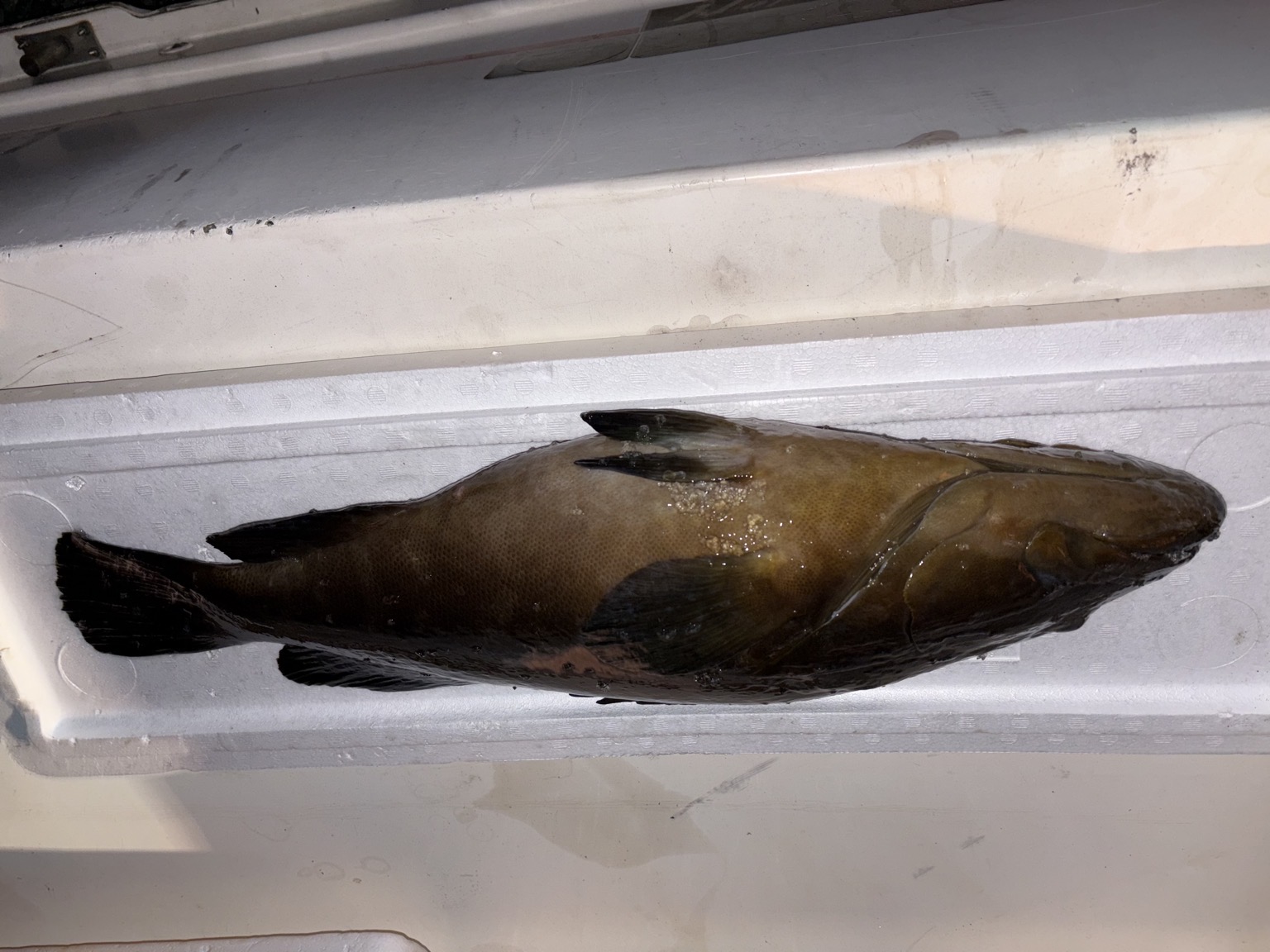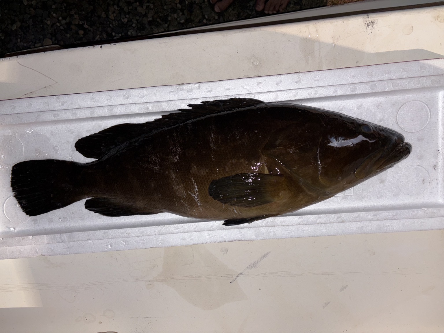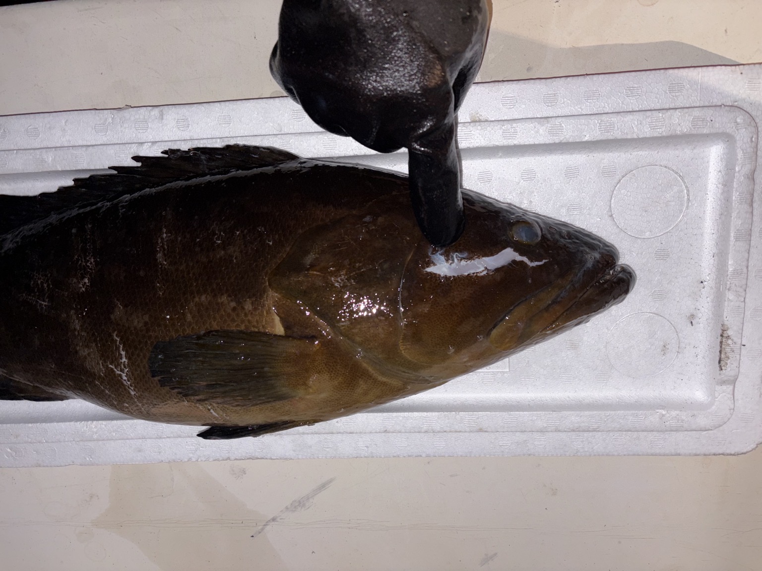 クエ4.0kです。 12月28日の夕方に千葉県南部で突いて漁獲されたものです。 水中でエラ等を切って血抜き、神経締めをしました。 陸では、海水氷による冷やし込み後、ビニールを被せて氷詰めで保管しております。 突いた場所は写真をご覧ください。