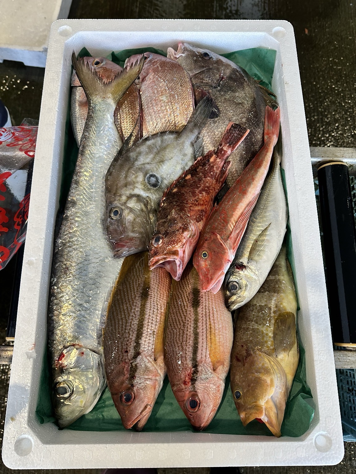 アオハタ、カサゴ、ヒゲソリダイ、ヒラ、ホウボウ、マアジ、マダイ、マトウダイ、ヨコスジフエダイ