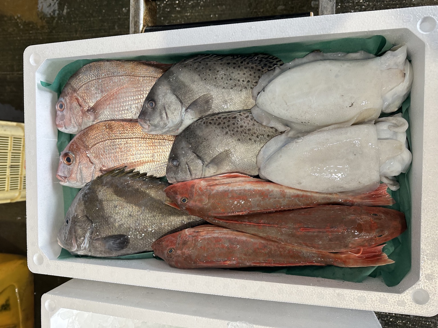 コショウダイ、ヒゲソリダイ、ホウボウ、マダイ、モンゴウイカ