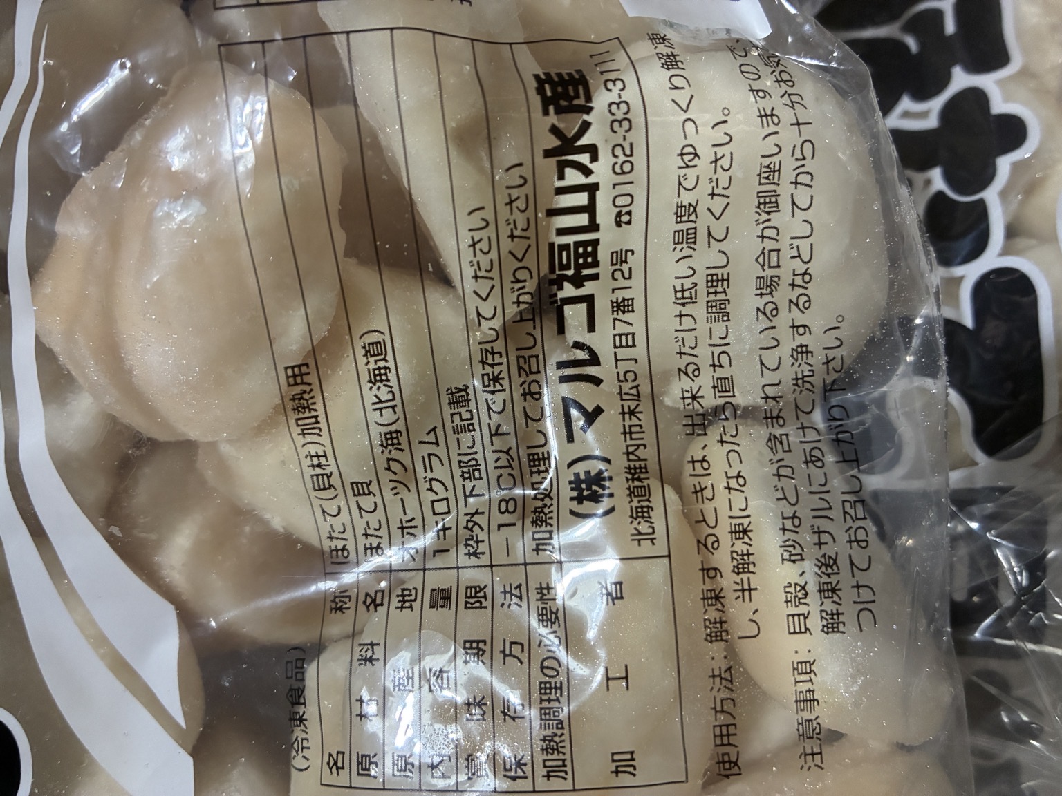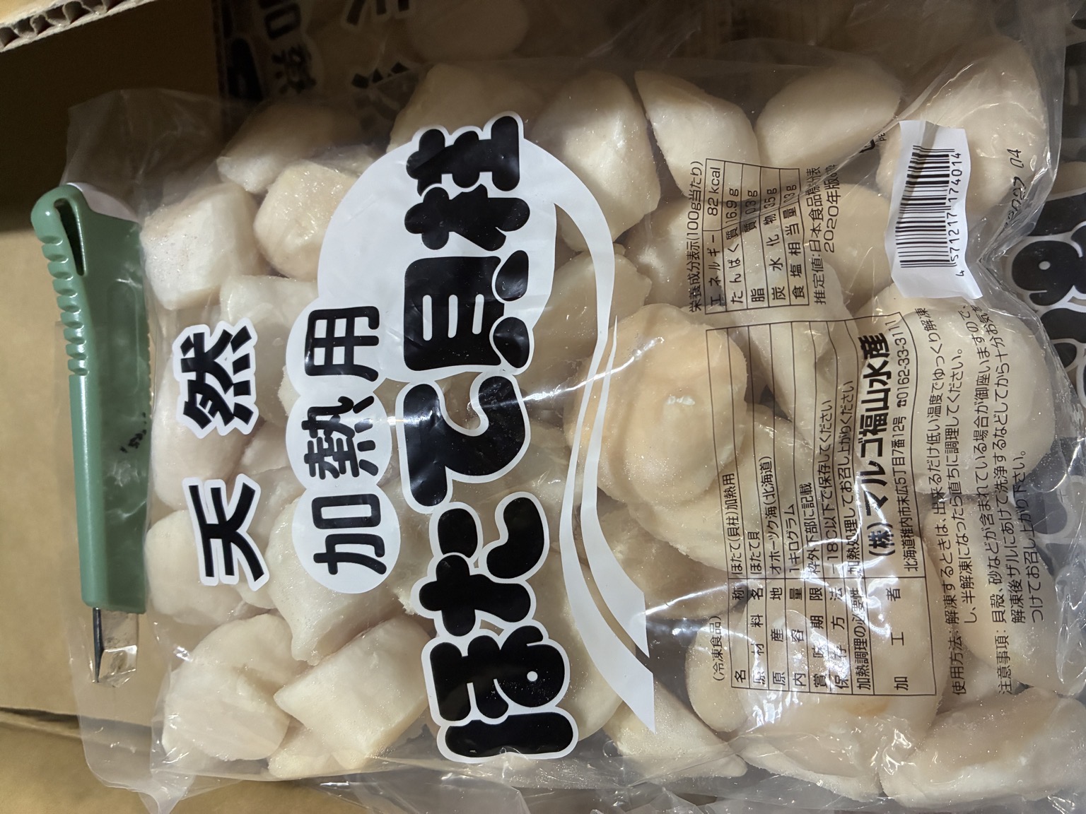 冷凍ホタテフレーク(1等) 1k12入 加熱表記ですが生食もいけるとのことです メーカーマルゴ福山 消費期限 27/4