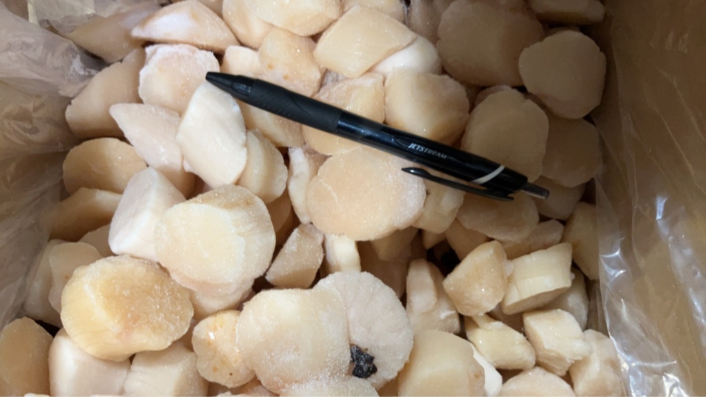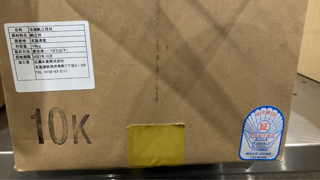 ホタテ貝柱のご案内です! オホーツク産ホタテ貝柱の少し欠けや、身に黒点があるものです。磨けば使用問題ありません。 荷印;マル互広瀬水産 賞味;2027.10
