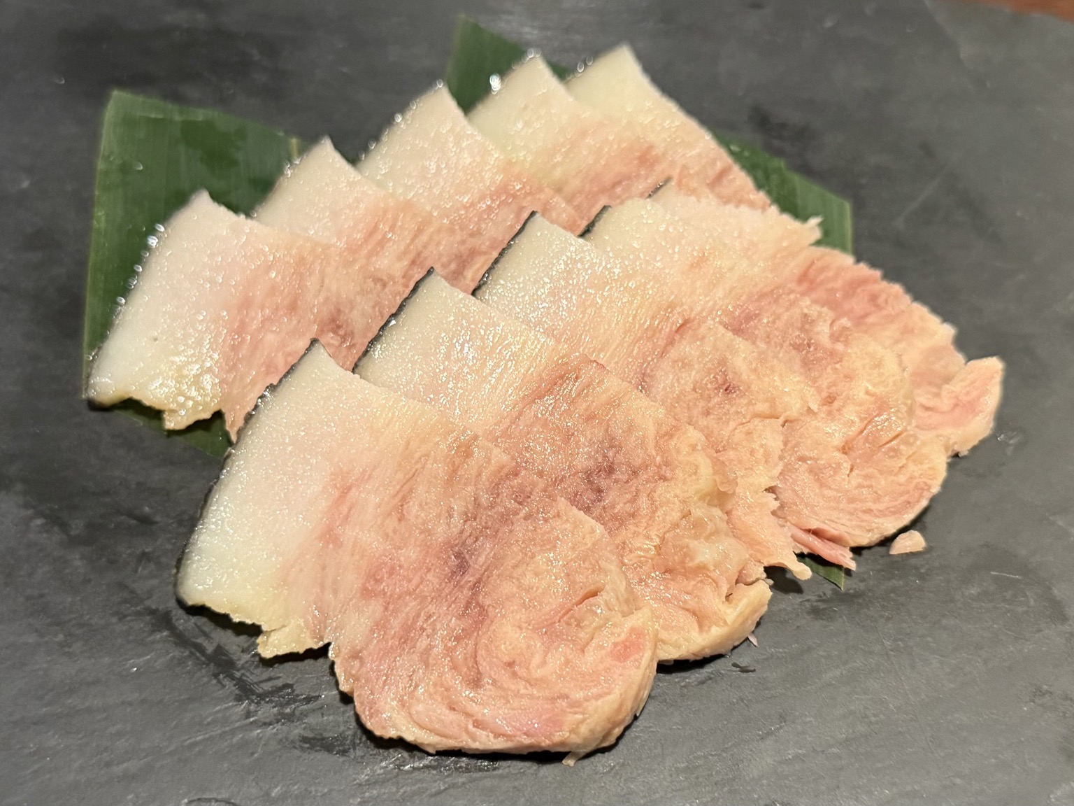 "さえずり"は鯨の舌になります。 添加物は使わずに丁寧にプルプルに炊き上げました。酢味噌、ポン酢、鍋物、おでんにいかがでしょうか。 解凍後そのままカットしてお使いください。 使いやすい約100gの小分が入っています。 ※一つずつ形状が多少変わります