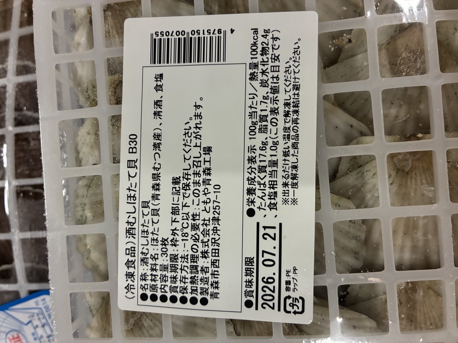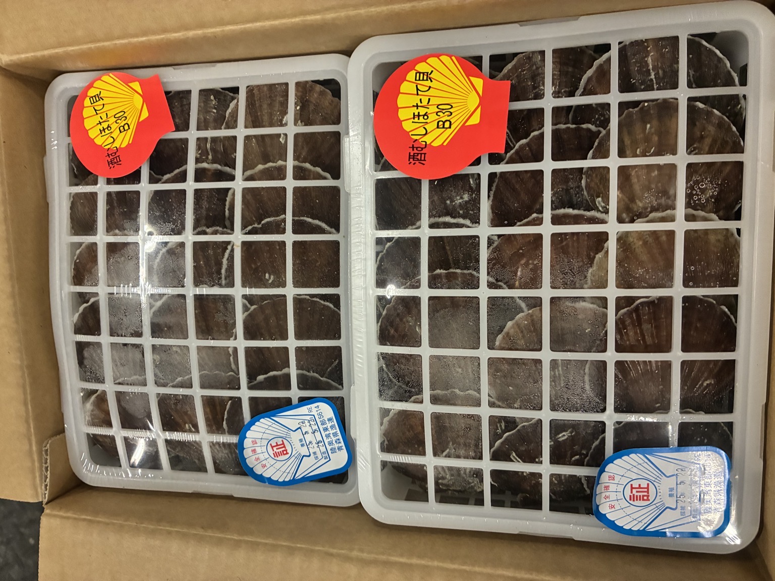 青森県産 生食用 冷凍殻付 酒蒸しホタテ30枚 1カゴ約600/650g 10カゴ入 6.5/7㎝ 解凍後そのまま食べれます。 うまい 賞味7/21 本来はもっと賞味長いです。なので特価にて!(通常は1カゴ2000円位)