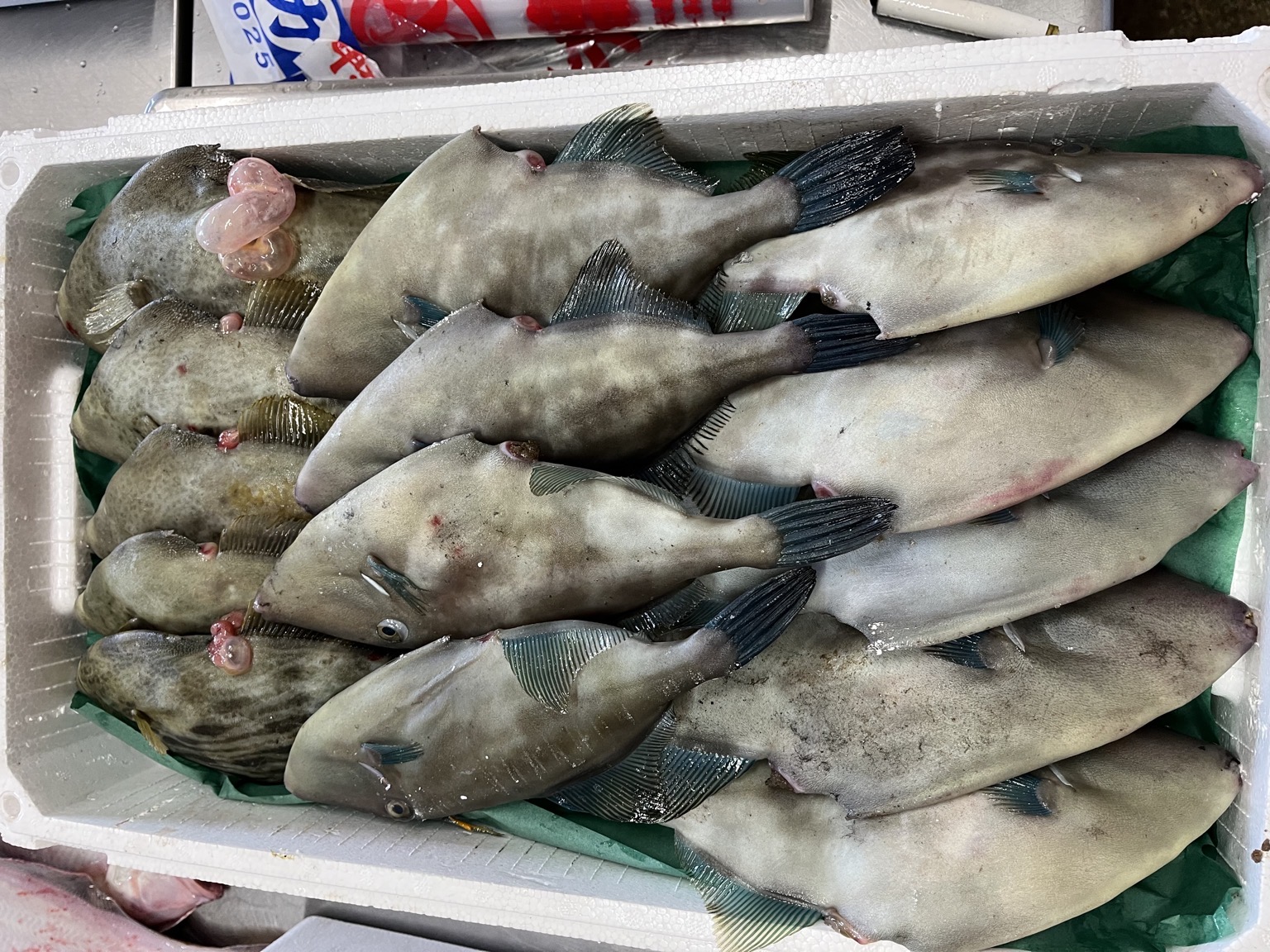 定置網で水揚げされました。 ウマヅラ9尾3.3k カワハギ5尾1.7k