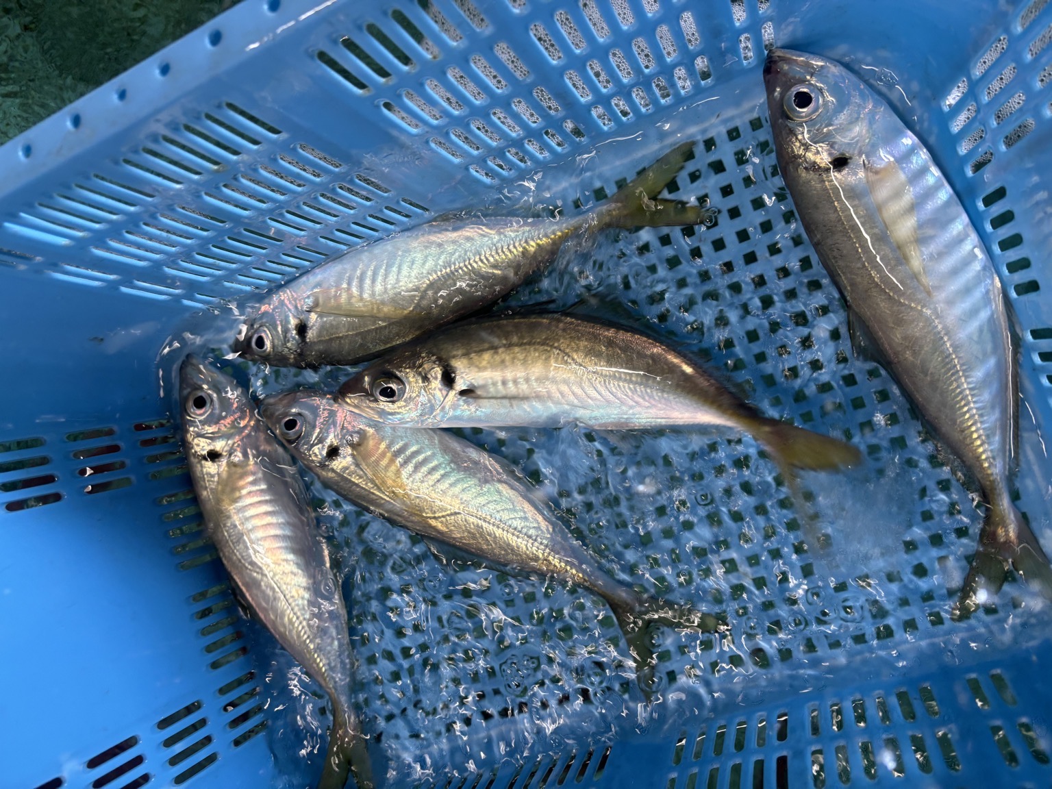 14日に水揚げされたアジを水槽でいかせています 釣りなので傷もなく綺麗な状態です