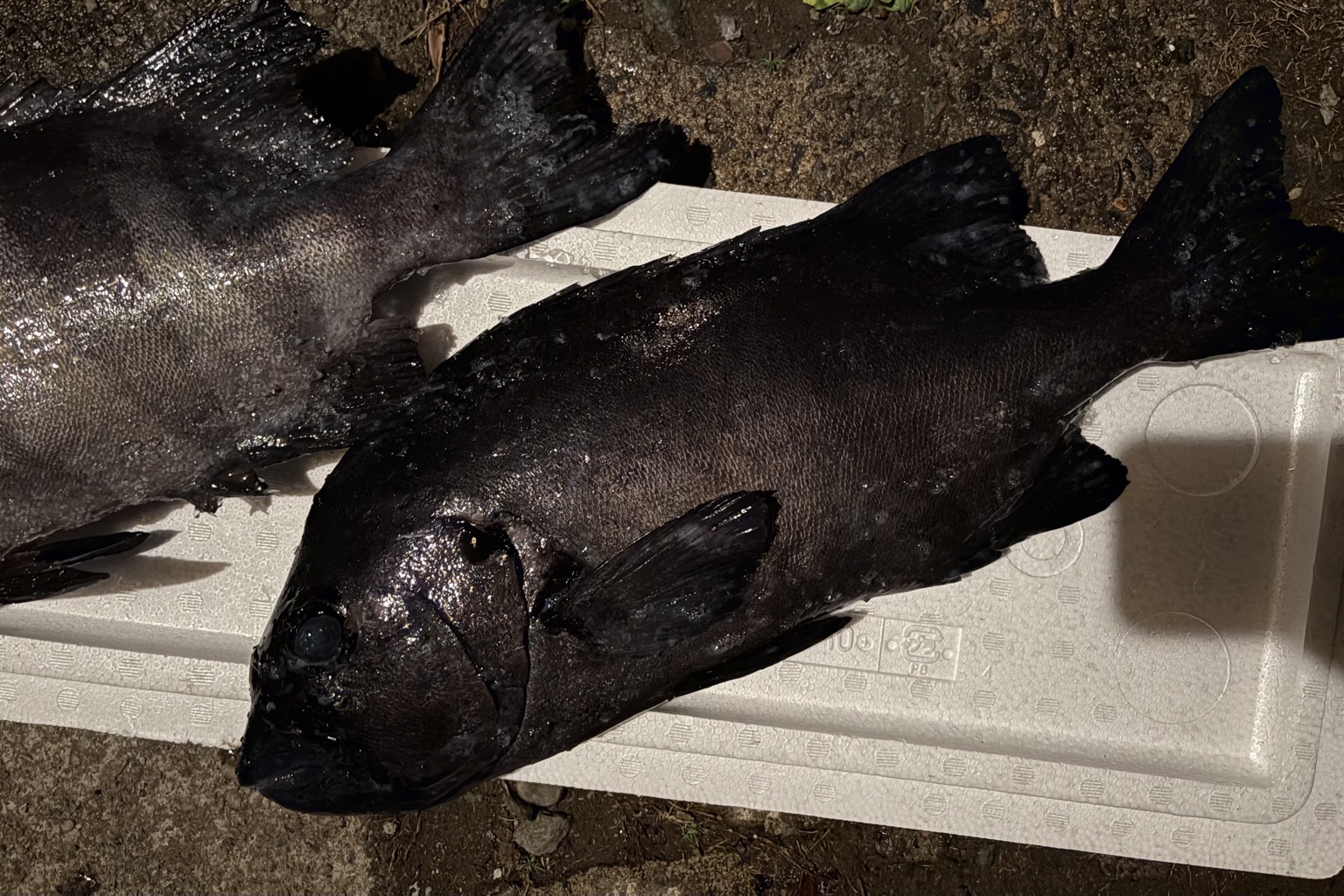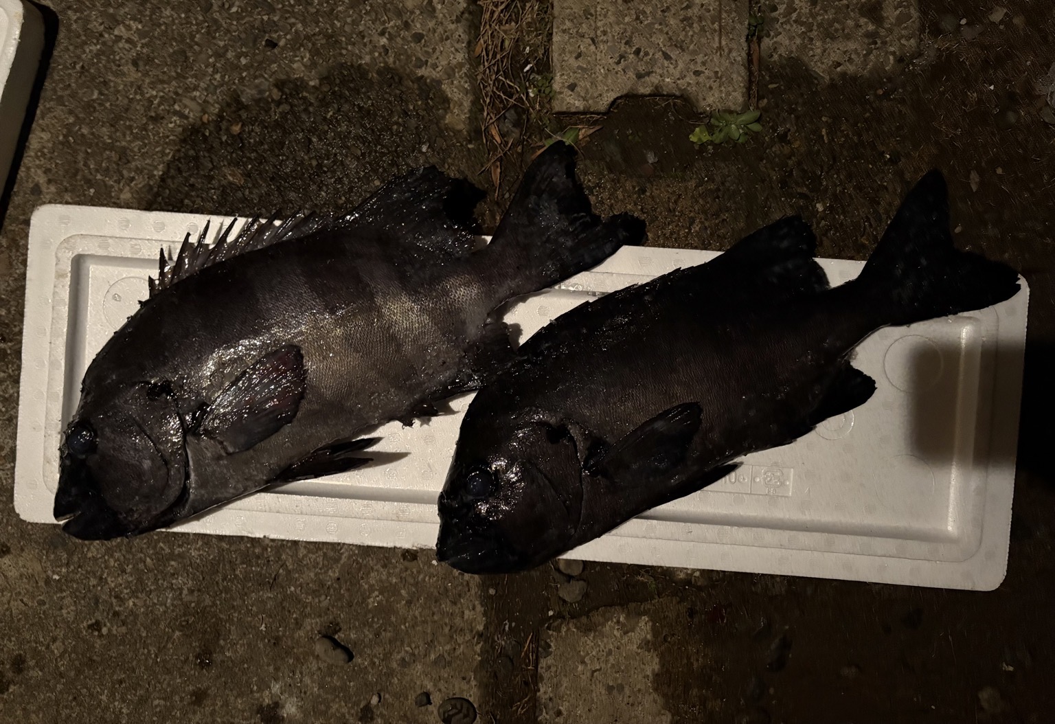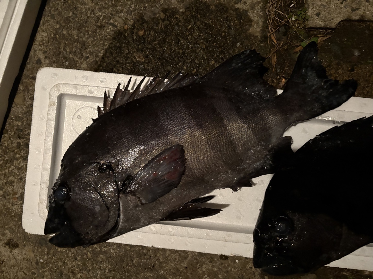 イシダイ2.3k、2.0kです。 2月18日の昼に千葉県の南房総で突いて漁獲されたものです。 水中でエラ等を切って血抜き、脳天締めをしました。 陸では、海水氷による冷やし込み後、ビニールを被せて氷詰めで保管しております。 突いた場所は写真をご覧ください。頭です。