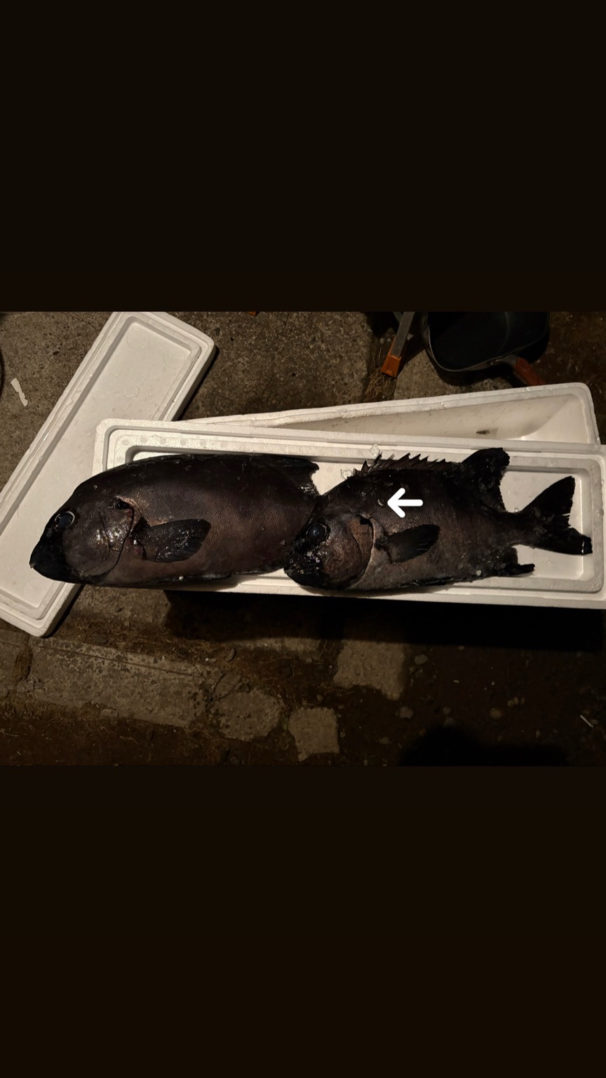 イシダイ1.9k、1.8kです。 2月18日の昼に千葉県の南房総で突いて漁獲されたものです。 水中でエラ等を切って血抜き、脳天締めをしました。 陸では、海水氷による冷やし込み後、ビニールを被せて氷詰めで保管しております。 突いた場所は写真をご覧ください。1匹目はあたま、2匹目は矢印の位置です。