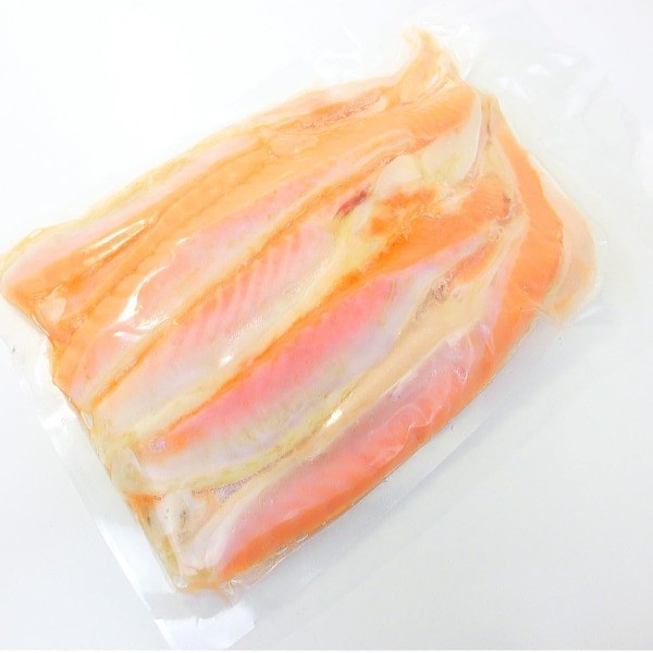 塩銀鮭ハラスのご案内です! ほどよく塩加減の効いたサーモンの大トロ(お腹の部分)だけをキレイに掃除して、 焼くだけで食べられるように加工し冷凍したお買い得な商品です。 銀鮭のハラスはとにかく脂の乗りが最高で、 焼いても茹でても中からジュワッと美味しい脂があふれ出てきます。 普段のお料理に使うサケをこちらの銀鮭ハラスに替えるだけで、 いつもと全く違った濃厚でジューシーな鮭料理になること間違いなしです。 こちらの銀鮭ハラスは、お魚特有の生臭さは無いに等しいくらいせず、 脂も嫌な匂いなどはしないので安心してお召し上がり頂けます。 焼くだけで美味しい塩鮭の焼き物になりますが、お好みで南蛮漬けやグラタンやシチューの具材、 パスタやチャーハンなどにも最適で、スープの具やお味噌汁にも是非お使いください。 非常にお買い得な価格での販売となっております。是非このチャンスをお見逃しなく!