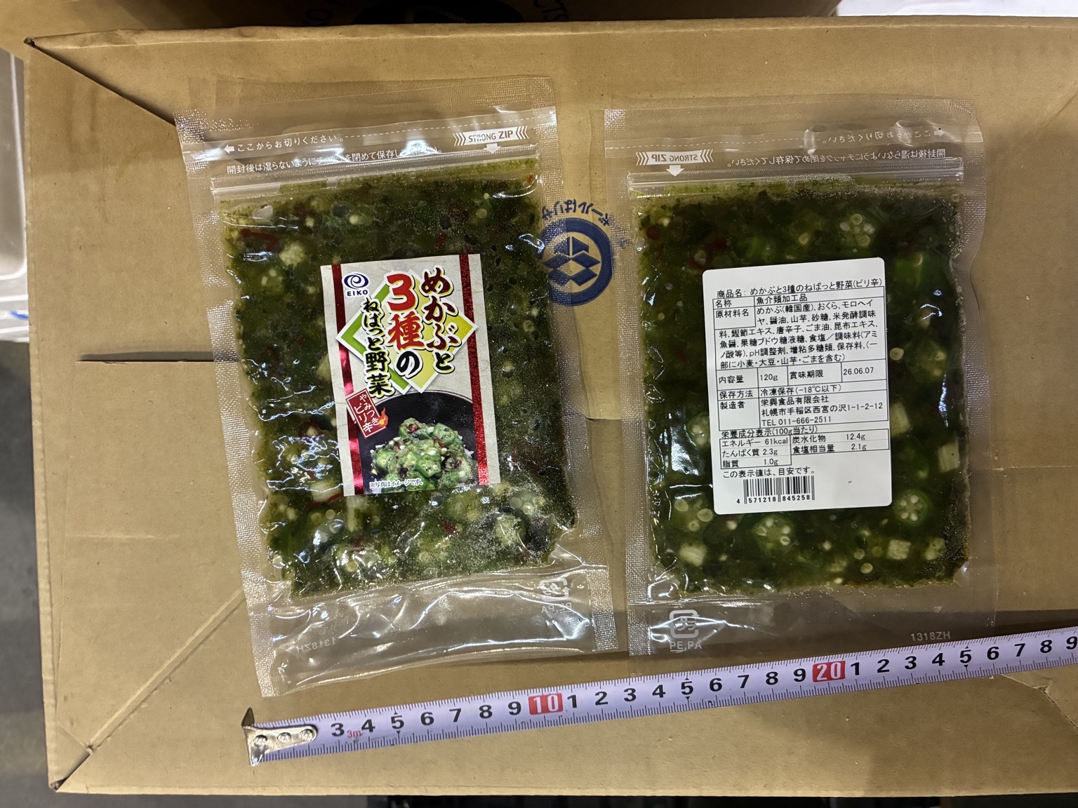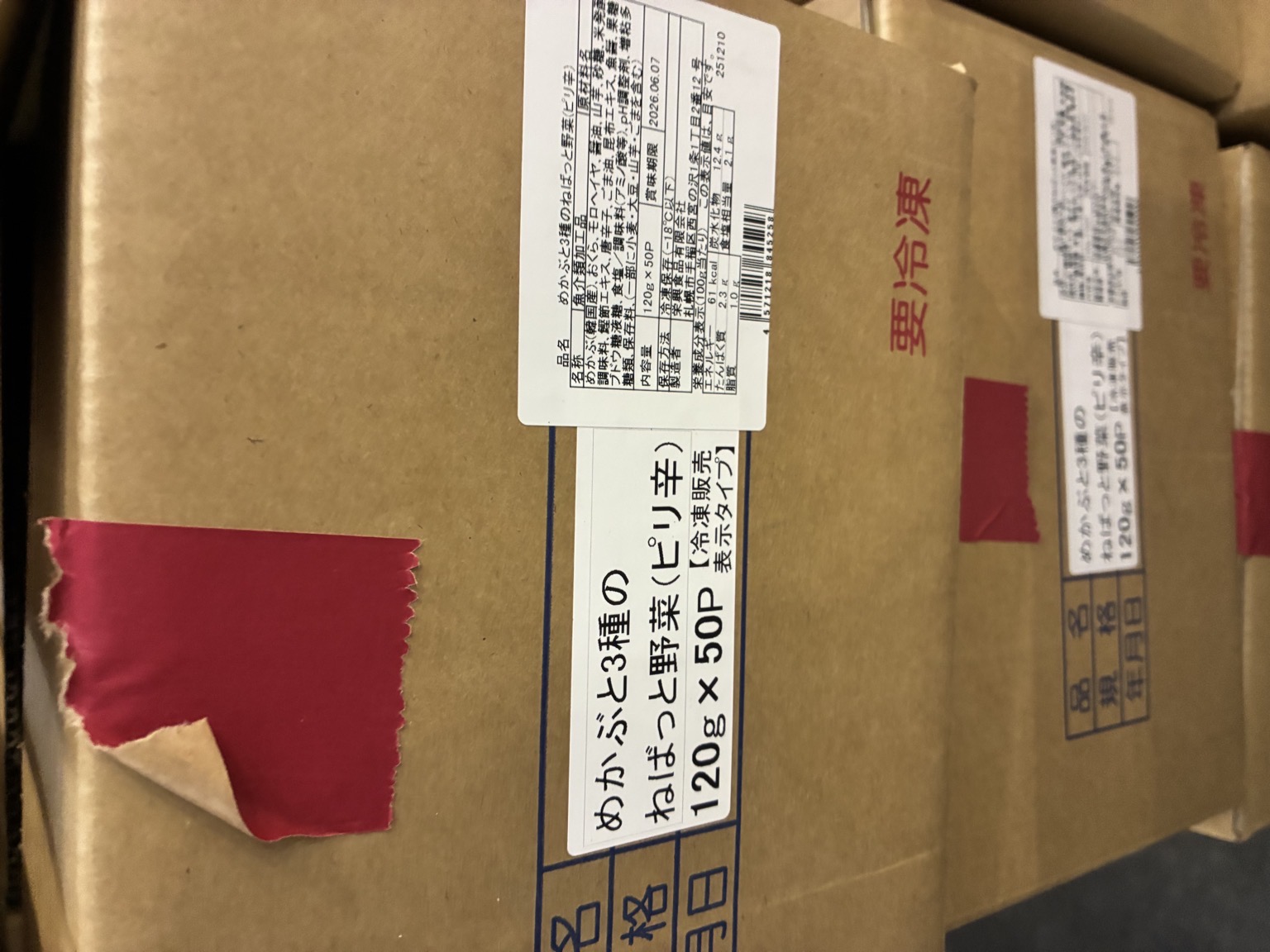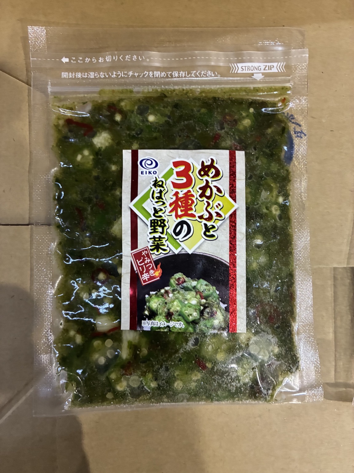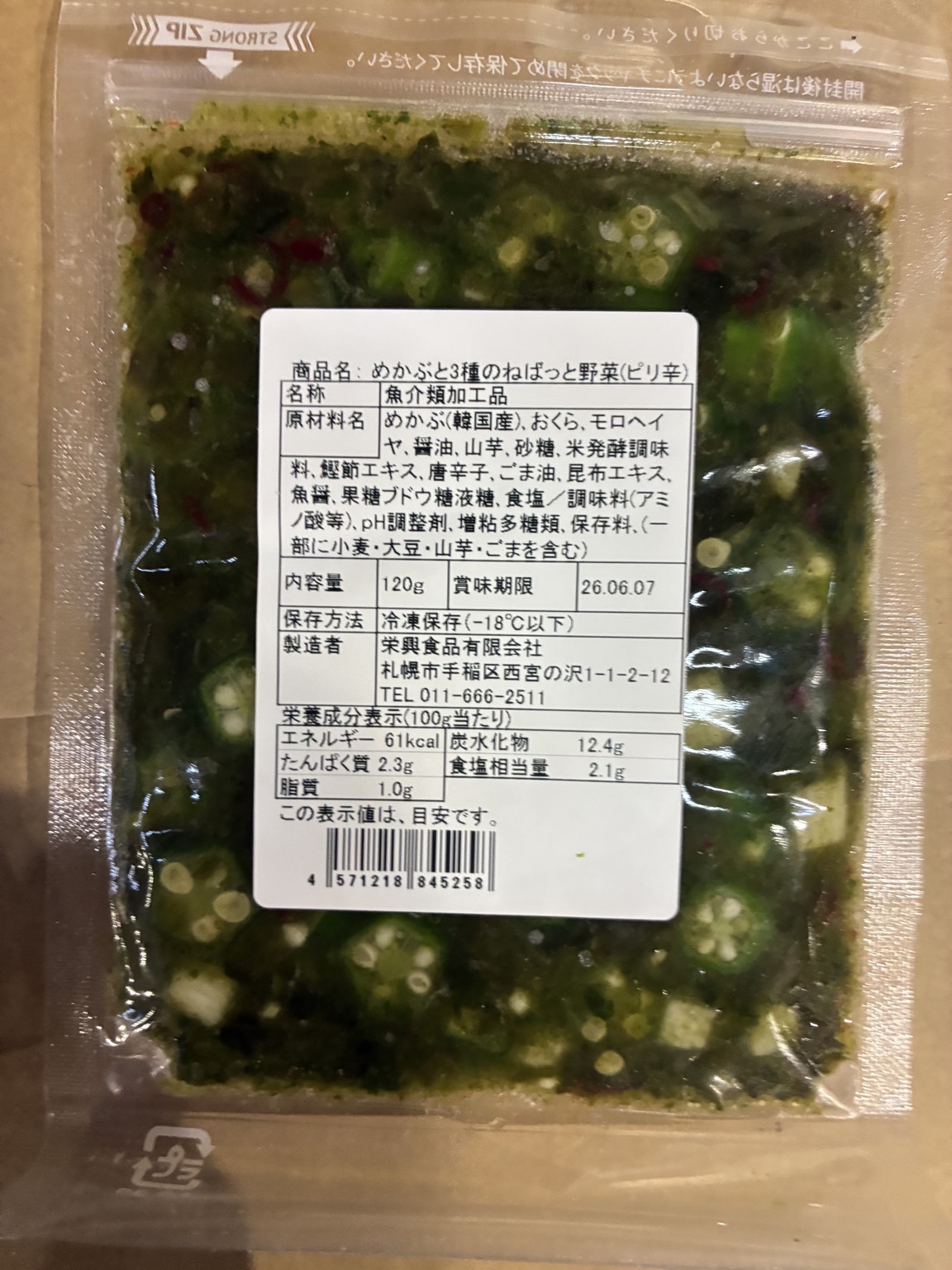 産地は加工地です。 冷凍 めかぶと3種のねばっと野菜120g やみつきピリ辛味 50×1 解凍後D+3 うまい❗️ ⚠️賞味6/7