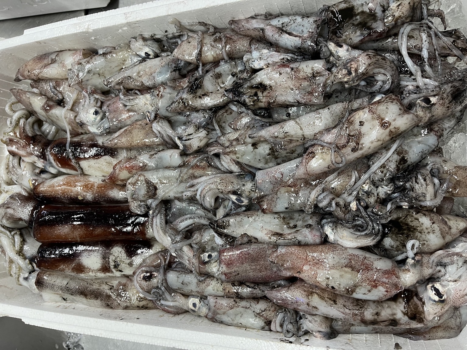 底曳網で水揚げされました。 色目良いですが明日出荷の為色目落ちます。 ケンサキイカ58尾3.6k スルメ5尾1.4k
