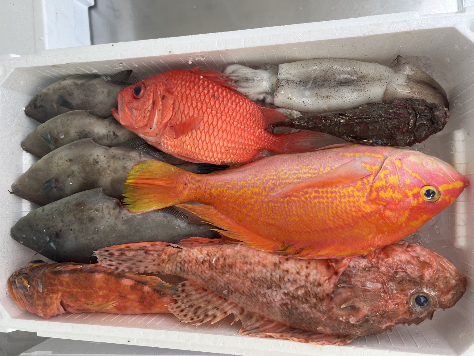アカイサキ、ウマヅラハギ、エビスダイ、オコゼ、オニカサゴ、スルメイカ
