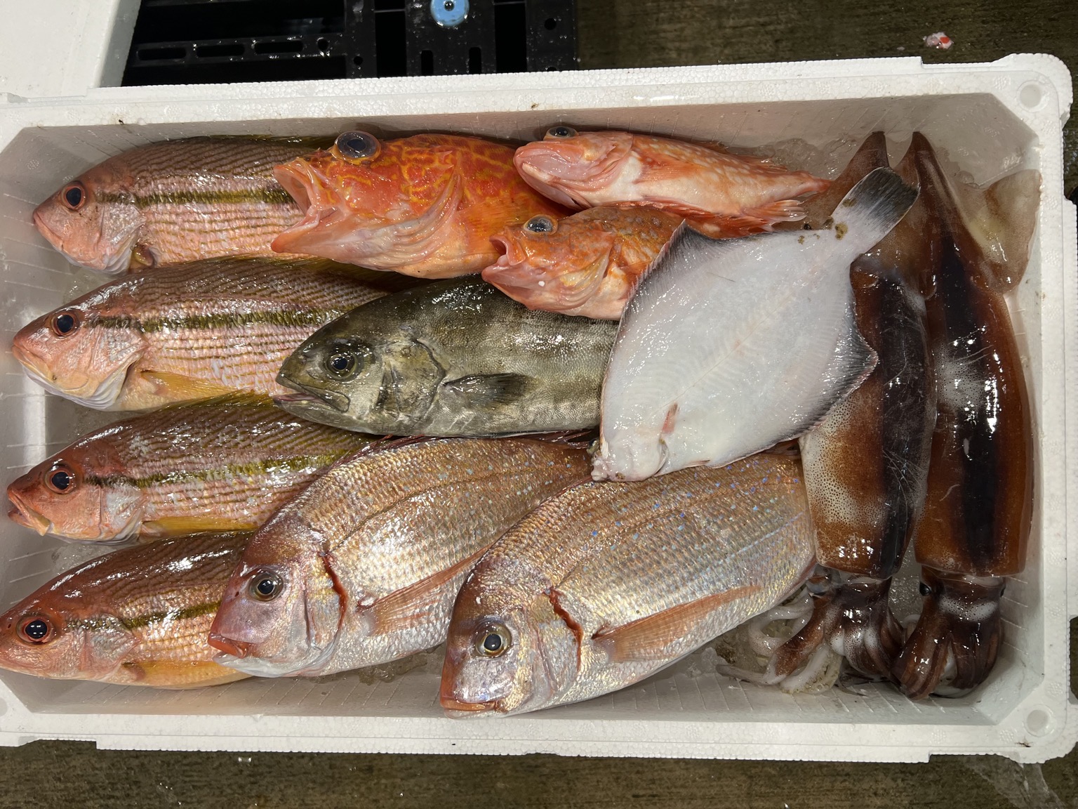カサゴ、スルメイカ、チダイ、ナガレメイタガレイ、ヨコスジフエダイ