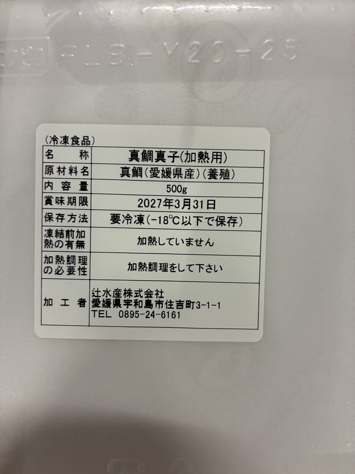 愛媛県産 養殖 冷凍 真鯛真子(タイ子)500gパック 加熱用 500g×20p