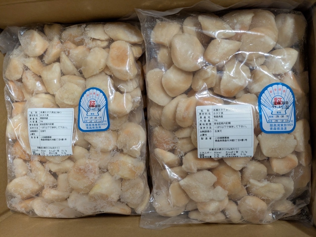 冷凍ホタテ 特フレーク 陸奥湾産 写真の通り 卵の色素沈着あり(オレンジ色) 生食可、風味、味問題なし 消費期限27年11月
