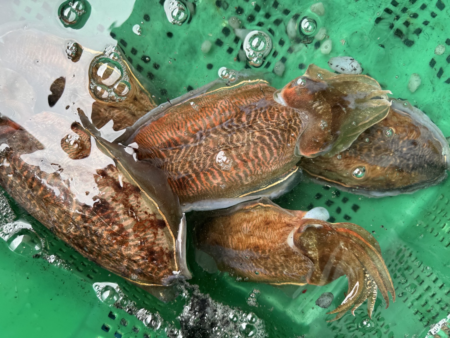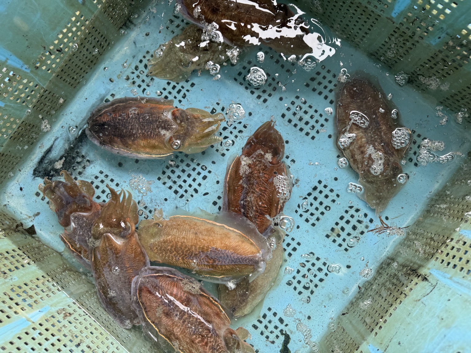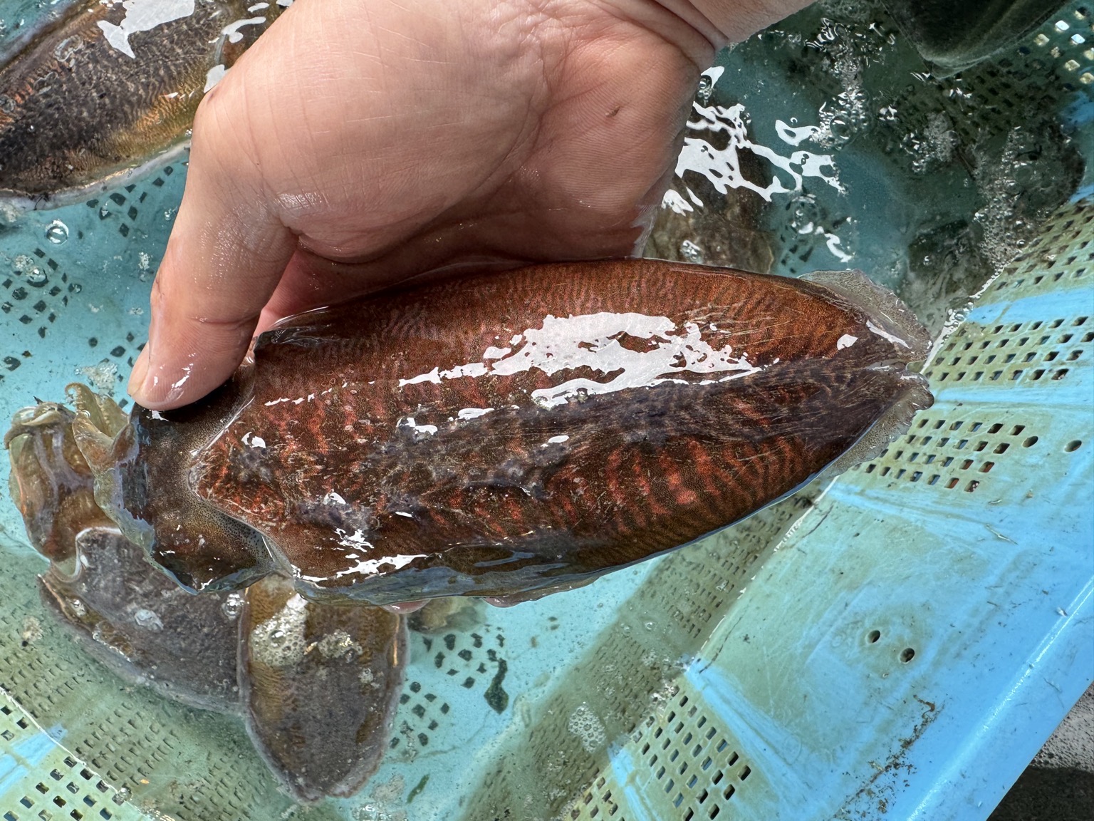 現在泳がしてます!出荷直前に活け〆出荷いたします!よろしくお願いします。ハリイカ新子です〜