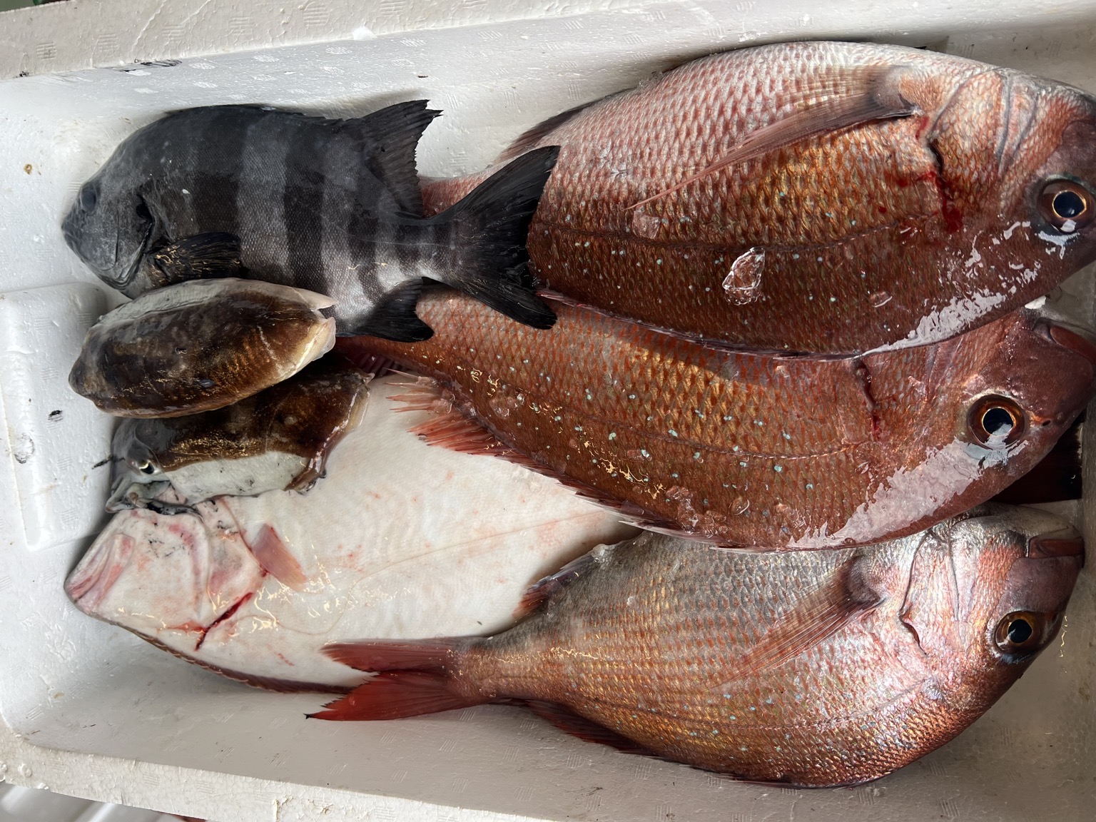 4/7水揚げ 活〆ヒラメ一枚 イシダイ一枚 マダイ3枚 コウイカ2杯