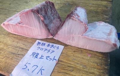 豊洲の競り場で競り落としたお買い得冷凍本鮪。 クロアチア産です。色良し。腹上トロ! 柵取りして出荷致します。 カットの要望があればメッセージ入れてください。 目方 5.7kg 在庫がこの一品だけですので、注文はお早めに!