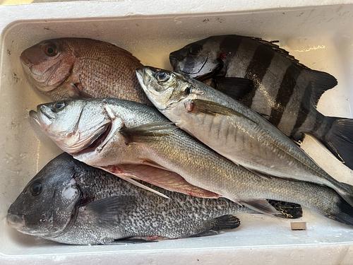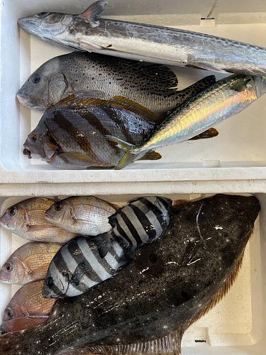 定置網 1/13、 8時水揚げ 活ヒラメ(出荷前活〆)1枚1.7キロ コショウダイ1.0キロ タカノハダイ0.7キロ サゴシ1.5キロ 小イシダイ、小タイ、サバ 鮮度良し、
