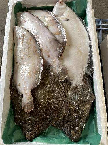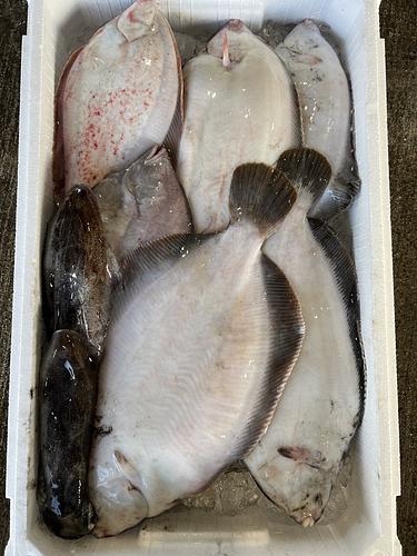 日帰り漁の底曳網で水揚げされました! サメガレイ2尾2.8k ナメタガレイ4尾2.7k 止めもの処分価格でよろしくお願いします。
