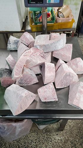 バチマグロのシミあり天身です。 天身ブロックのままで出荷。ブロックサイズはまちまちです。 外見から判断しているのでシミの入り具合は様々です。アタリもハズレもあるかと思います。